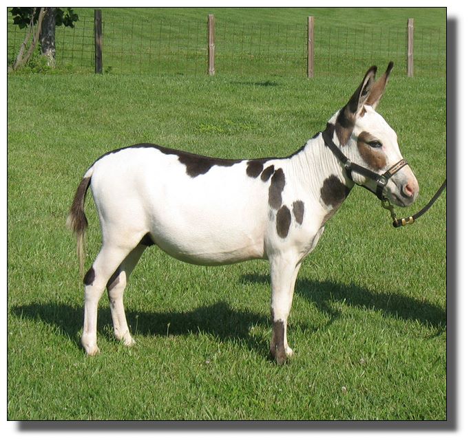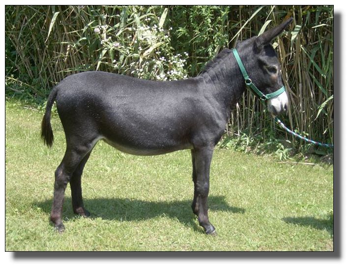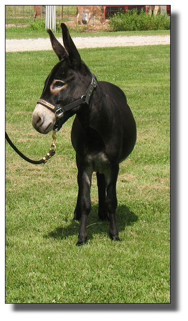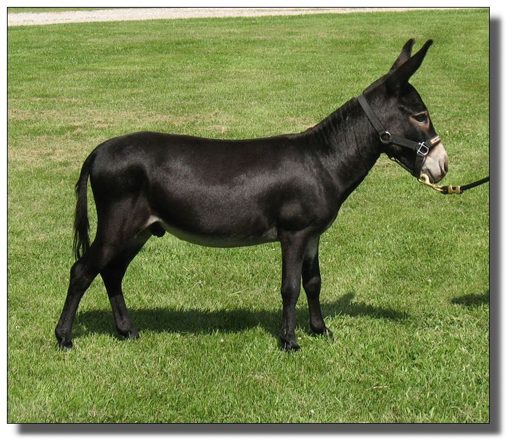 A dynamic jack, a true black with a flashy white belly. Wide chest, good bone, pretty head, a pedigree he's proud of, and the great temperament that his sire and grandsire are known for. Dynamo is a fine breeding prospect who has already started his career at Elms Farm.