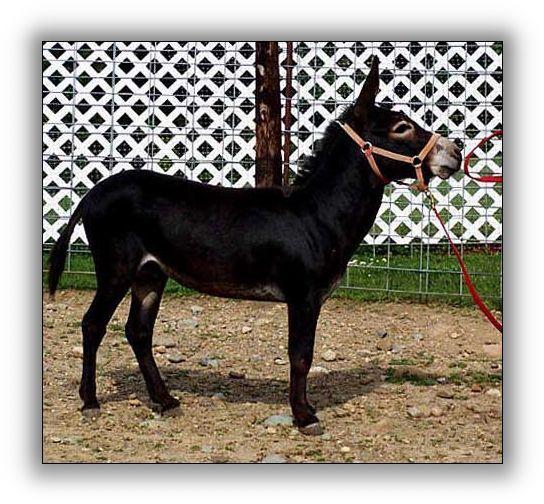 Candy is a sweet jennet with good bone and good conformation. She has multiple generations of my breeding in her pedigree. Great jacks like, Rustico, The Fireman, Red Baron, Jackpot and Mr. Tee, and jennets like Sootie, one of my best black jennets, fill her pedigree. Candy will be an asset to any breeding program with blacks or sorrels. Eye Candy is UK Stud Book Eligible.
