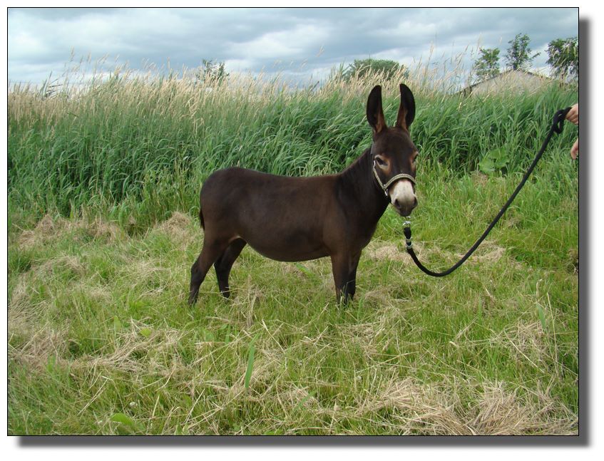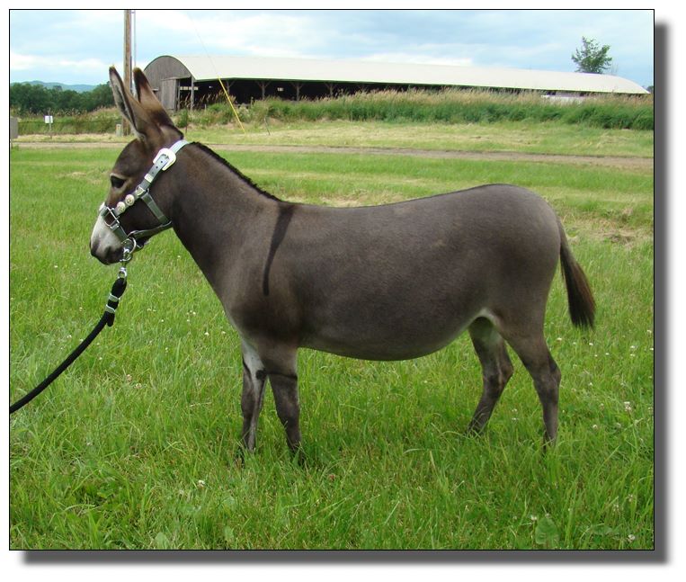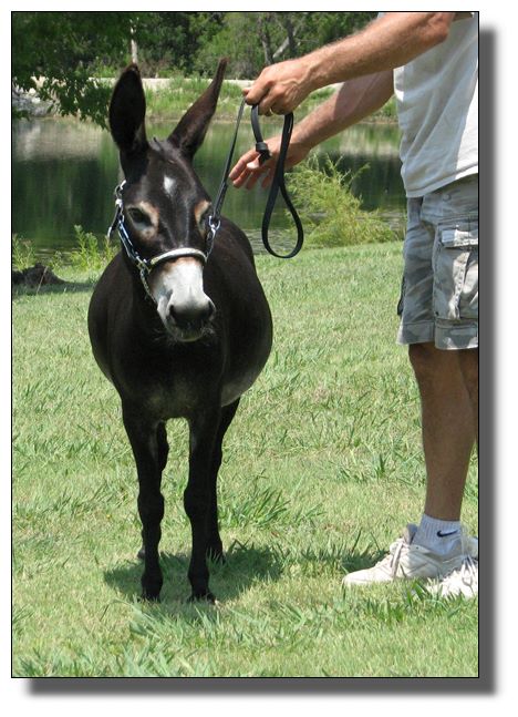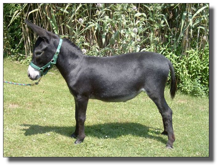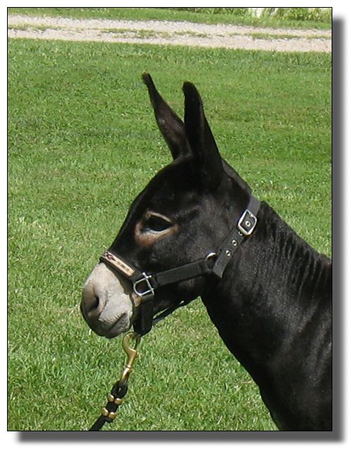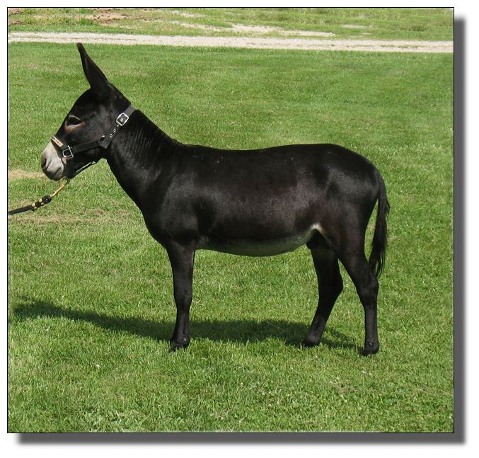 A dynamic jack, a true black with a flashy white belly. Wide chest, good bone, pretty head, a pedigree he's proud of, and the great temperament that his sire and grandsire are known for. Dynamo is a fine breeding prospect who has already started his career at Elms Farm.